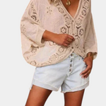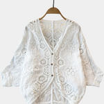 Delicada y sin esfuerzo chic, esta blusa de encaje de crochet con calados combina el encanto vintage con la elegancia bohemia moderna. Confeccionada en algodón transpirable, presenta bordados florales, un escote en V profundo y detalles intrincados de encaje para un look romántico y libre. Perfecta para los días de verano, para usar sobre bralettes o combinar con jeans de cintura alta para un estilo bohemio atemporal.