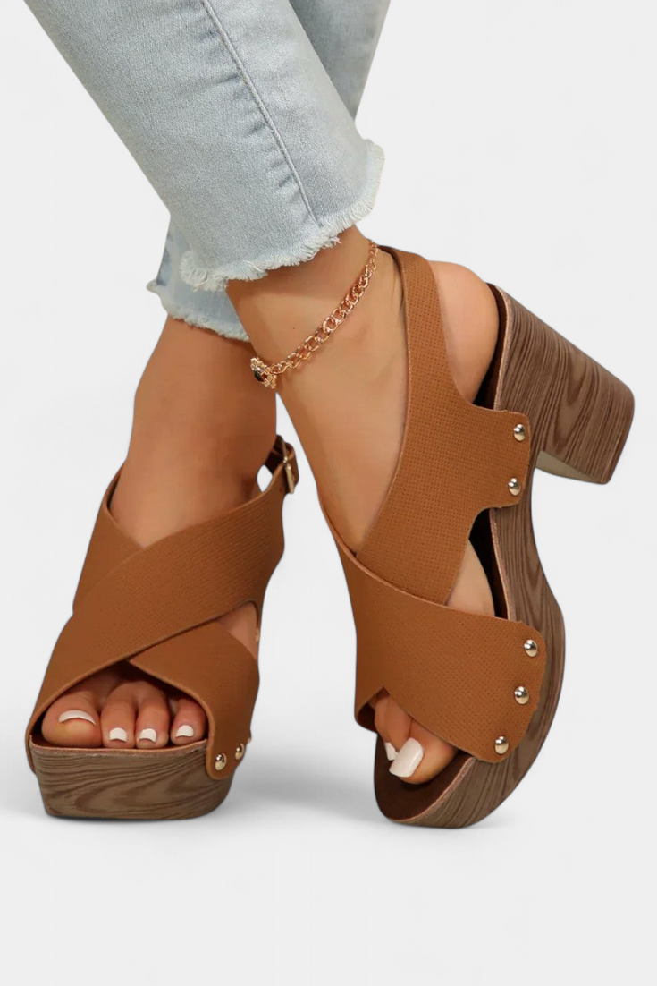 • Diseño con tiras cruzadas y remaches metálicos para un acabado chic
