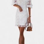 Frescura mediterránea con un aire coqueto y encantador. Este vestido ajustado en encaje floral celebra la silueta con elegancia mientras las mangas abullonadas y el escote corazón realzan el estilo con un toque romántico y actual.