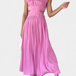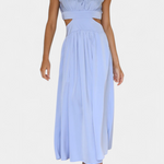 Moderno y etéreo, este conjunto largo combina líneas escultóricas con un diseño minimalista que realza la silueta. Su escote alto, aberturas laterales y corte fluido crean una estética elegante, perfecta para días luminosos o eventos de temporada con un aire sofisticado.