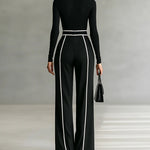 Compuesto por un top de manga larga con cuello alto y ribete blanco en contraste y unos pantalones de pierna ancha con cinturón a juego, ofrece una imagen pulida, equilibrada y versátil.